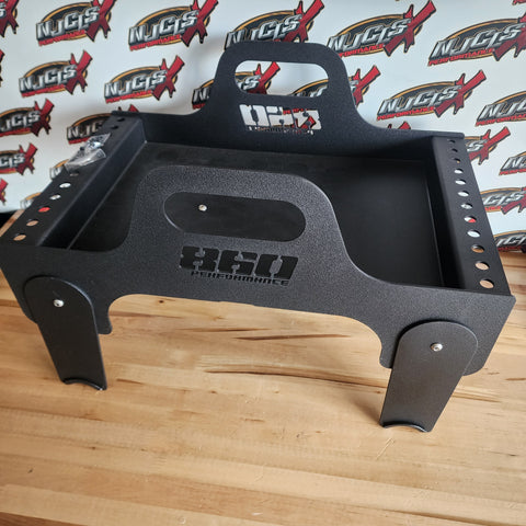 Experience unparalleled versatility and durability with our Universal Intake Mount Tool Tray. Crafted from .125" thick aluminum, this tray seamlessly mounts onto fuel rails, carburetors, or throttle bodies, offering adjustable extension legs for precise intake clearance. Suitable for fuel rail lengths of 13.5” or longer, it comes complete with mounting rings for both 4150 and 4500 carburetors/throttle bodies, plus rubber plugs for hole filling. Boasting ample tool placement space and accommodating up to 12 spark plugs per side, it's essential for enthusiasts. Elevate your setup with the optional matte texture black powder coat finish for a sleek, professional touch.